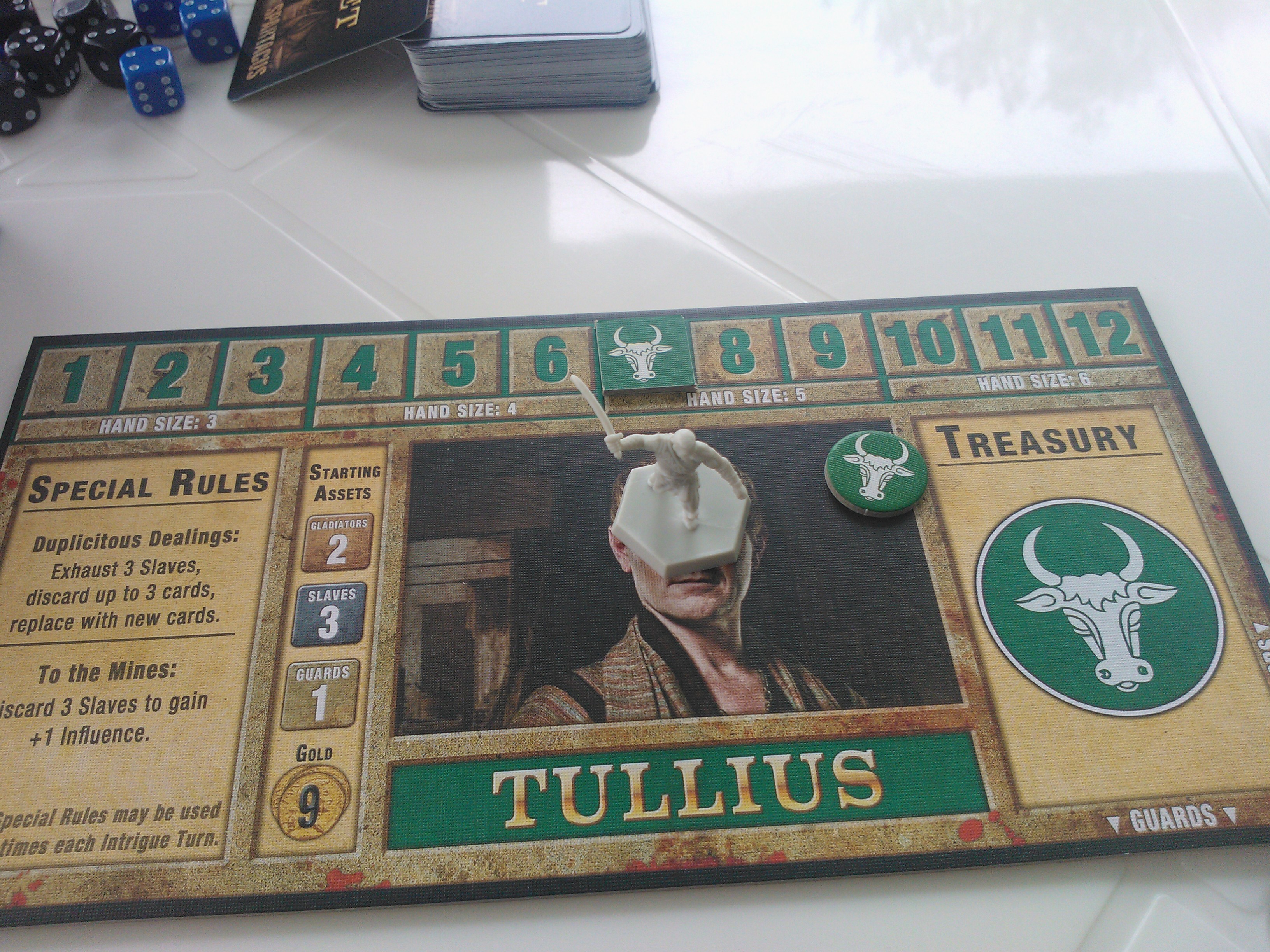 O jogo, do meu amigo Gustavo Costa, mostra toda a dinâmica e traições do seriado que deu origem ao jogo. Estão lá os personagens presentes na série além de uma boa dinâmica de luta na arena. Gladiadores melhores realmente fazem picadinho dos gladiadores mais fracos. Apostar contra seu próprio gladiador as vezes faz parte para conseguir ouro suficiente para adquirir um melhor na próxima vez que o mercado de escravos abrir.