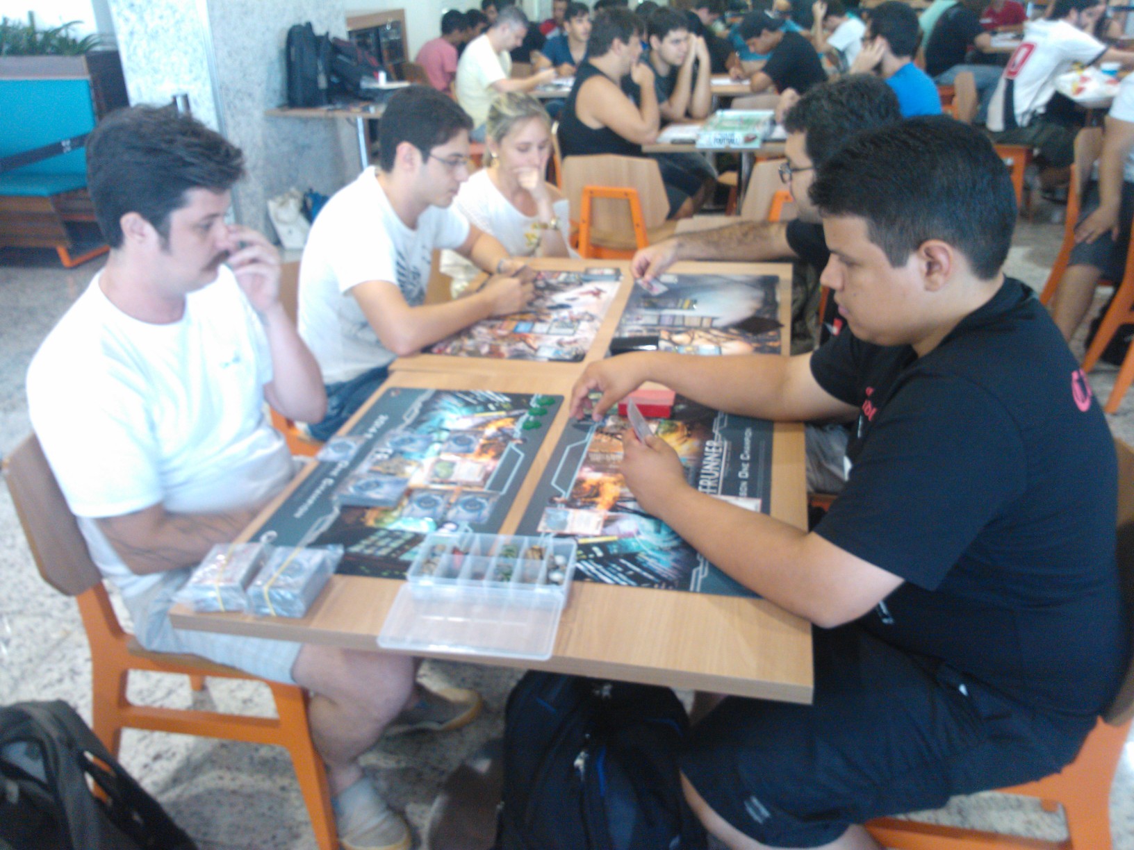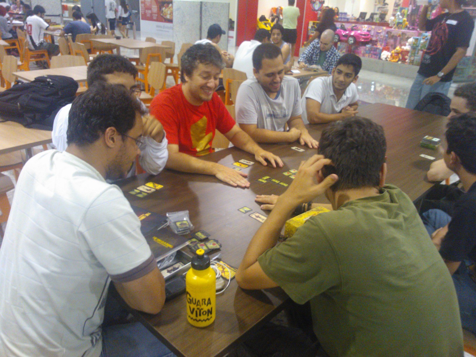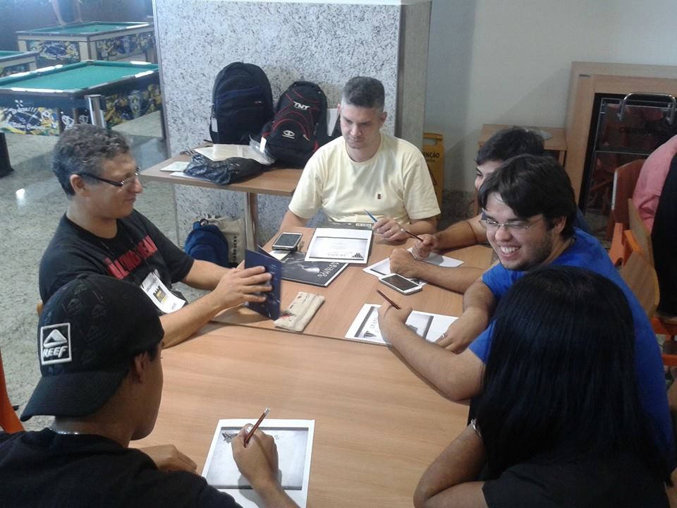 Aconteceu ontem, 07/06, o primeiro dia do 1º Encontro de RPG da Dungeon Capixaba que está rolando na praça de alimentação do Shopping Montserrat em Serra/ES. Somente neste primeiro dia cerca de 100 pessoas estiveram presente ao evento que teve entre suas atrações jogos de board games, como Horse Fever, One Night, Pizza Box Football, Descent, Spartacus, X-Men, Card Games como, Love Letter, Citadels, Magic, Battle Scenes, Dice Games, com uma demonstração mais do que especial de Duelo de Dados feita pelo próprio autor do jogo, e mesas de RPG, com o Velhinho do RPG narrando Abismo Infinito, Márcio narrando uma aventura de Vampiro: A Máscara e Alcides mestrando uma aventura de The Shotgun Diaries.