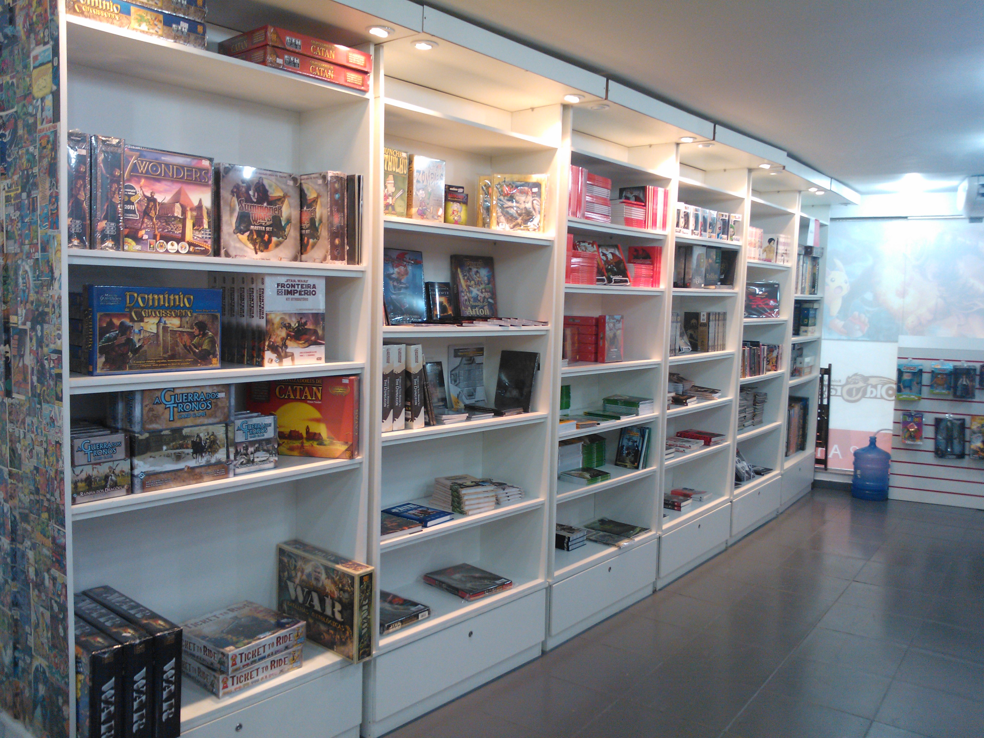 A próxima grande novidade da loja será a locação de jogos de tabuleiro. Já estavam expostos os jogos que serão locados e o acervo é muito bom, com vários jogos importados vencedores de vários prêmios internacionais.