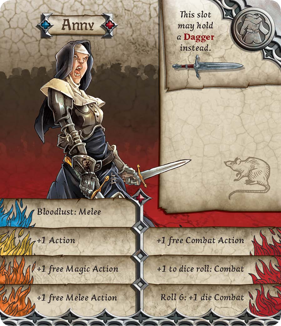 Com uma história traumática como a de Anny não é de surpreender que no nível azul ela tenha a habilidade “Bloodlust: Corpo a Corpo.” Bloodlust permite que ela se mova duas zonas e ganhe uma ação extra para combate corpo a corpo. Além disso ela tem um espaço em sua ficha onde pode-se colocar uma carta de um punhal no lugar de armadura, que vai vir a calhar se você optar por equipar Anny com magias ou um escudo.