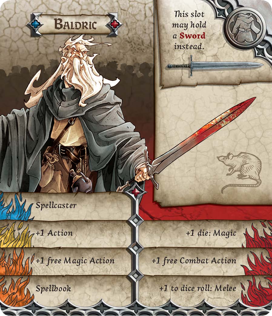 Anos de dedicação ao mundo da magia serviram bem a Baldric, o que lhe permite chegar a uma idade avançada inteiro. Ele começa com a habilidade “Mago” no nível azul. Com Mago um personagem recebe uma ação extra de magia em sua vez, ou uma ação encantamento, sendo que ambos são novos para Zombicide. Os Sobreviventes podem agora se equipar com feitiços de combate, que são tratados como armas de longo alcance, então você vai ser capaz de lançá-los em zonas dentro do alcance da magia e resolver os seus efeitos com um rolamento bem sucedido. E tem também as magias de encantamento, que não têm efeitos de combate, mas ainda são muito úteis para coisas como, curando feridas, ficando invisível, etc. Baldric tem a opção de carregar uma espada, deixando seus slots de mãos livres para carregar magias.