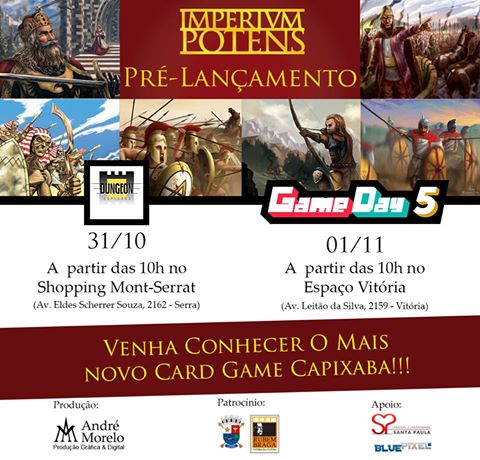 - Haverá também o pré-lançamento de “Imperium Potens“, de André Morelo, e mais playtests, do já sucesso entre os jogadores do ES, “Minas Gerais“, de Lucas Tassi.
