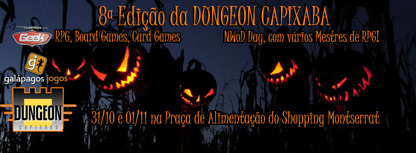 A 8ª Edição da Dungeon Capixaba promete ser fantástica! Mais uma vez o grupo de jogadores do Espírito Santo irão se reunir na praça de alimentação, 3º piso, do Shopping Mont Serrat neste sábado e domingo, 31/10 e 01/11, das 10h00 às 20h00. Será mais um final de semana cheio de jogos e diversão para todas as idades. Vejam a programação do evento: