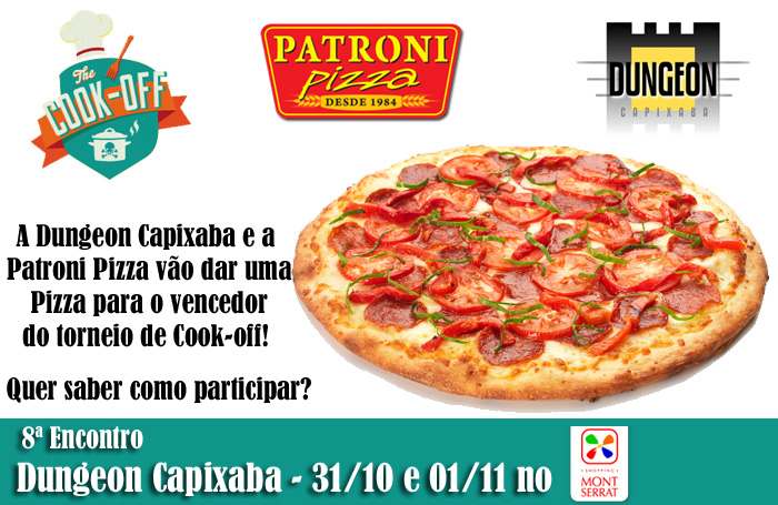 A Dungeon Capixaba e a Patroni Pizza vão dar uma piza para o vencedor do torneio de Cook-off que vai acontecer durante o evento no próximo final de semana!