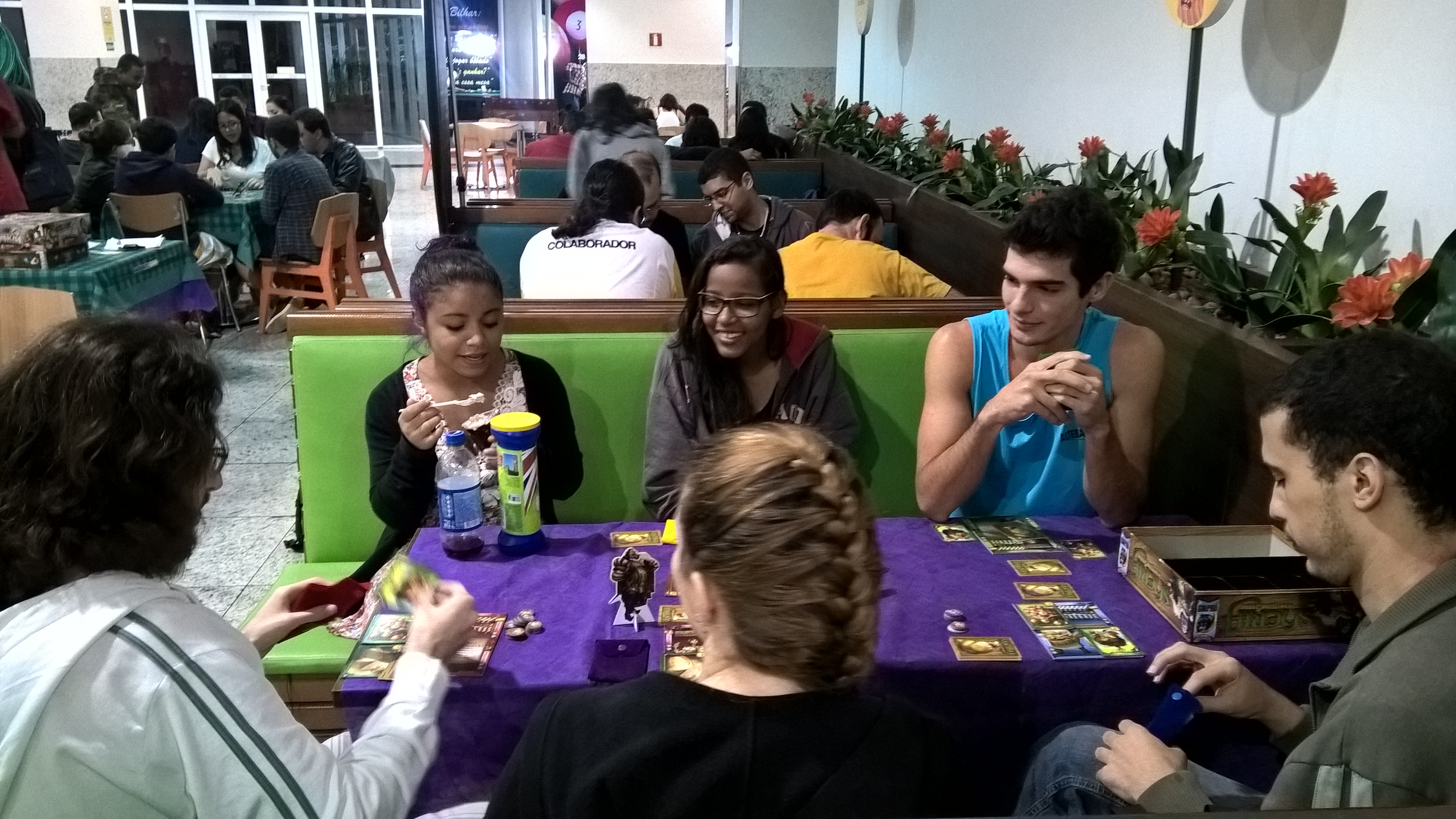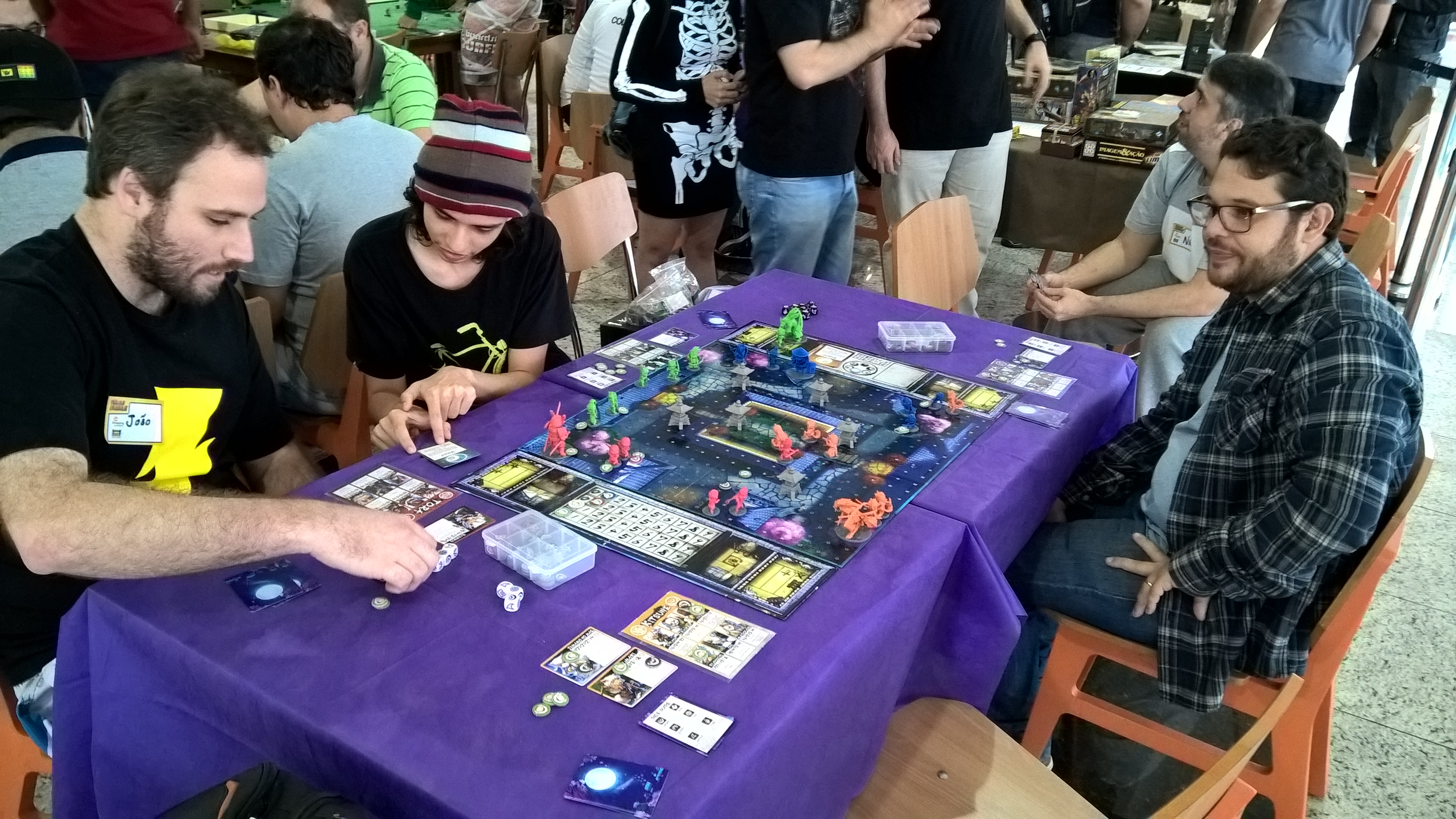 Aliás outro patrocinador também esteve presente, foi a Galápagos Jogos, que enviou jogos para serem sorteados entre os participantes do evento. Como o evento tinha como tema “O Chamado de Cthulhu“, varios jogos com a temática estiveram nas mesas como Eldritch Horror, Elder Sign, Cthulhu Dice, Munchkin Cthulhu, entre outros. Estiveram presentes também o Café Nanquim, levando suas revistas independentes para serem conhecidas pelo público, assim como o Luiz Paulo Faustini, autor do livro “Maretenebrae” que estava autografando seus livros.