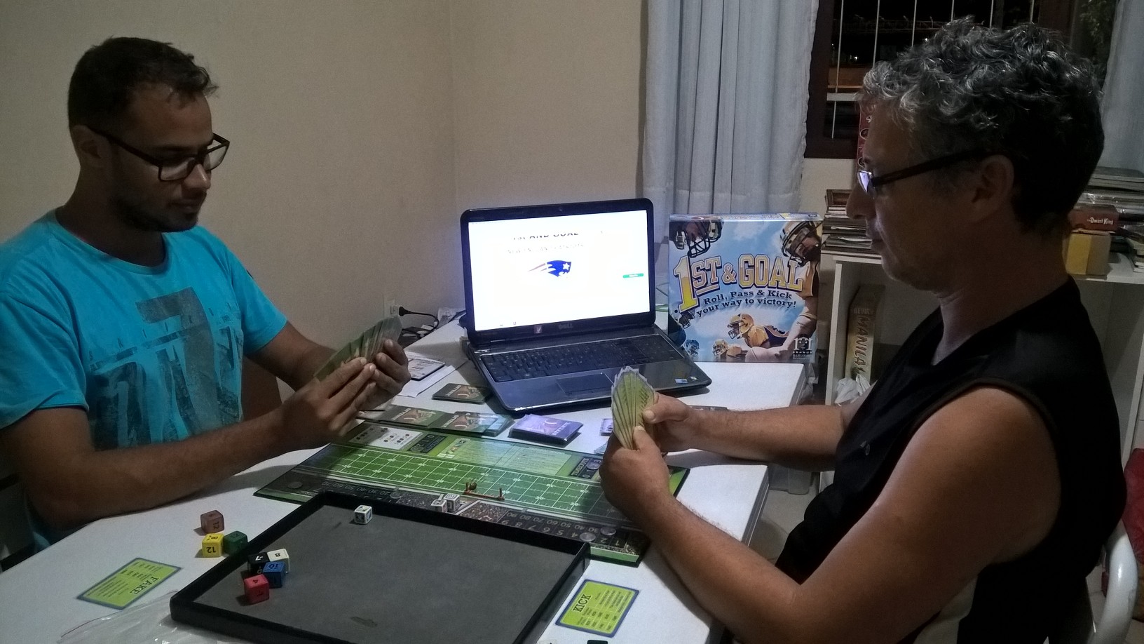 Mas gosto muito também de jogar futebol americano no tabuleiro. Eu há três anos venho fazendo a simulação da final com um dos jogos de tabuleiro que tem como tema futebol americano, o Pizza Box Football. Os criadores do jogo distribuem todo ano uma ficha com as estatísticas dos times que vão para o Super Bowl para que os jogadores façam a simulação da grande final e enviem o resultado para eles. Nos anos anteriores o resultado virtual da minha simulação sempre foi diferente do resultado oficial, mas este ano eu tinha uma novidade: adquiri mais um jogo de tabuleiro de futebol americano, o 1st & Goal, e decidi fazer duas simulações, uma com cada jogo.