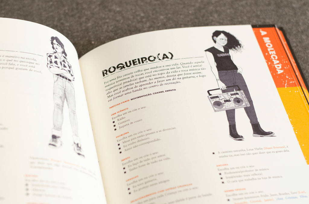 Os jogadores irão interpretar crianças ou adolescentes com o esteriótipo típico mostrado em filmes do gênero (como Goonies, Super-8, E.T.) tendo entre as opções o Atleta, o Nerd, o Esquisito, o Popular, etc. A construção de personagem é rápida, intuitiva e o capítulo dedicado a criação de personagem dá todas as dicas para montar seu adolescentes. Há alguns detalhes interessantes do sistema que é a escolha por parte de cada jogador de um item icônico para seu persoangem, que pode ser um diário, uma guitarra ou um skate; um problema que o personagem passa, como os pais que estão para se divorciar, sofrer bullying dos valentões da escola ou não ter dinheiro; escolher um orgulho, como o pai ser cientista, não ser covarde, se achar lindo, entre outros detalhes que ajudam a construir o personagem e torná-lo único. Os vários detalhes na criação do personagem vem com exemplos bem detalhados, inclusive com sugestão de nome para o personagem em sueco, americano e brasileiro!