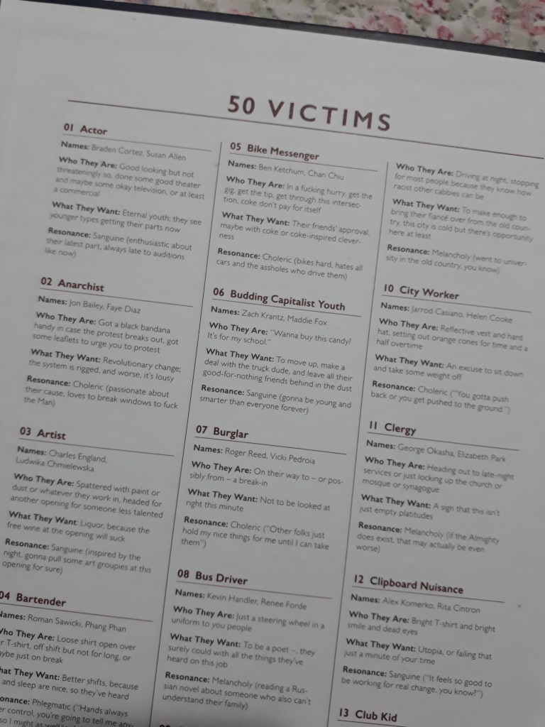 Algumas diferenças na edição nacional em relação a importada chamam a atenção, e a principal pra mim é o fato da edição nacional não vir com a lista de 50 vítimas aleatórias que vem impressa na contra-capa do livro importado. É bem útil e eu já utilizei algumas vezes, até mesmo pra criar aquele NPC mais que secundário que de repente aparece na aventura.