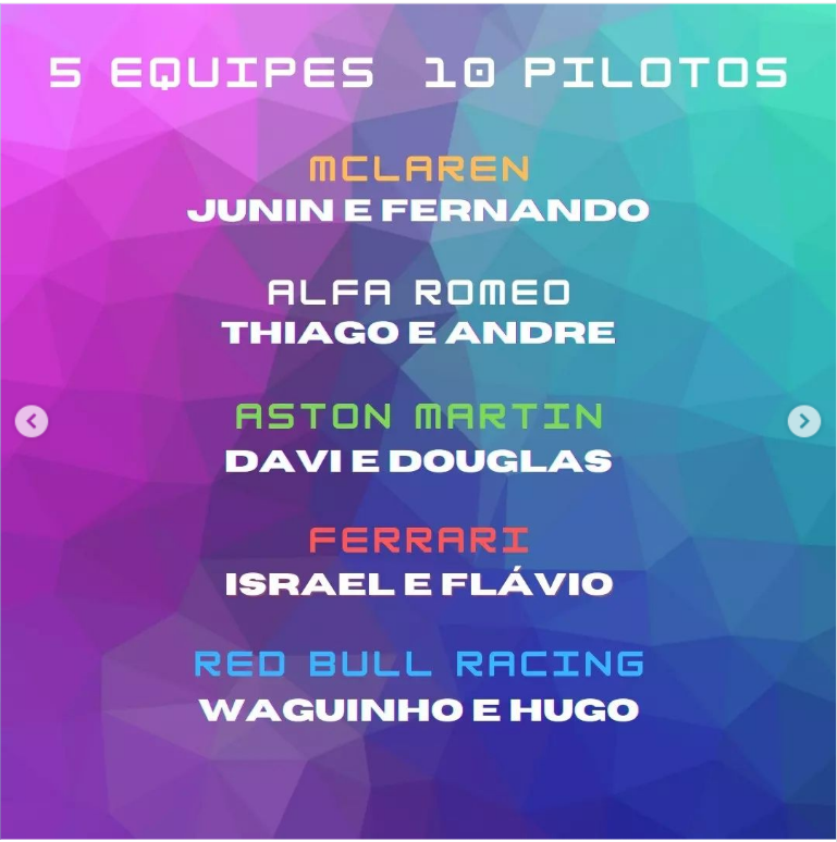 Usamos os nomes verdadeiros das equipes de Fórmula 1 para nossas corridas. Este ano carros amarelos são McLaren, brancos Alfa Romeo, azuis RBR, vermelhos Ferrari e verdes Aston Martin.