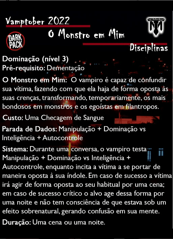 Além disso no perfil do Instagram da Tatiana (@tati_malkaviangel) você pode encontrar vários novos níveis de poderes das disciplinas vampíricas. Uma entre as que mais gosto é a de baixo.