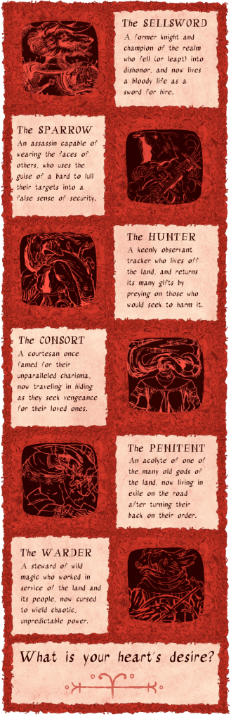 São eles: um mercenário, um ex-cavaleiro que caiu em desonra e agora vive empregrando sua espada para quem puder pagar; um assassino com a habilidade do disfarce, podendo assumir a face de outra pessoa, e anda disfarçado como um bardo para dar falso sentido de segurança as pessoas que estão com ele; um caçador que rastreia e caça aqueles que tentam ferí-lo; um consorte que era famoso por sua incomparável carisma e que agora viaja disfarçado procurando vingança por seus entes queridos; um acólito de um deus antigo que vive no exílio depois de virar as costas para sua antiga ordem; um carceireiro amaldiçoado com um poder imprevisível. Juntos, eles jogarão para descobrir se lutam com unhas e dentes para escapar da taverna, ou se rendem ao seu abraço e se tornam parte dela para sempre.