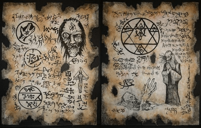 O Necronomicon – chamado de “Al Azif“, em árabe – é um livro que teria sido escrito em Damasco por volta de 730 d.C. por Abdul Alhazred, um poeta nascido no Iémen. Ele visitou as ruínas de Babilônia e os subterrâneos de Memphis, passando dez anos sozinho no grande deserto do sul da Arábia—o Roba el Khaliyeh ou “Espaço Vazio” – e o deserto “Rubro” ou “Dahna”, que é conhecido por ser habitado por espíritos protetores e monstros da morte. É dito que Alhazred foi devorado vivo em plena luz do dia por demônios invisíveis na frente de várias testemunhas incrédulas.