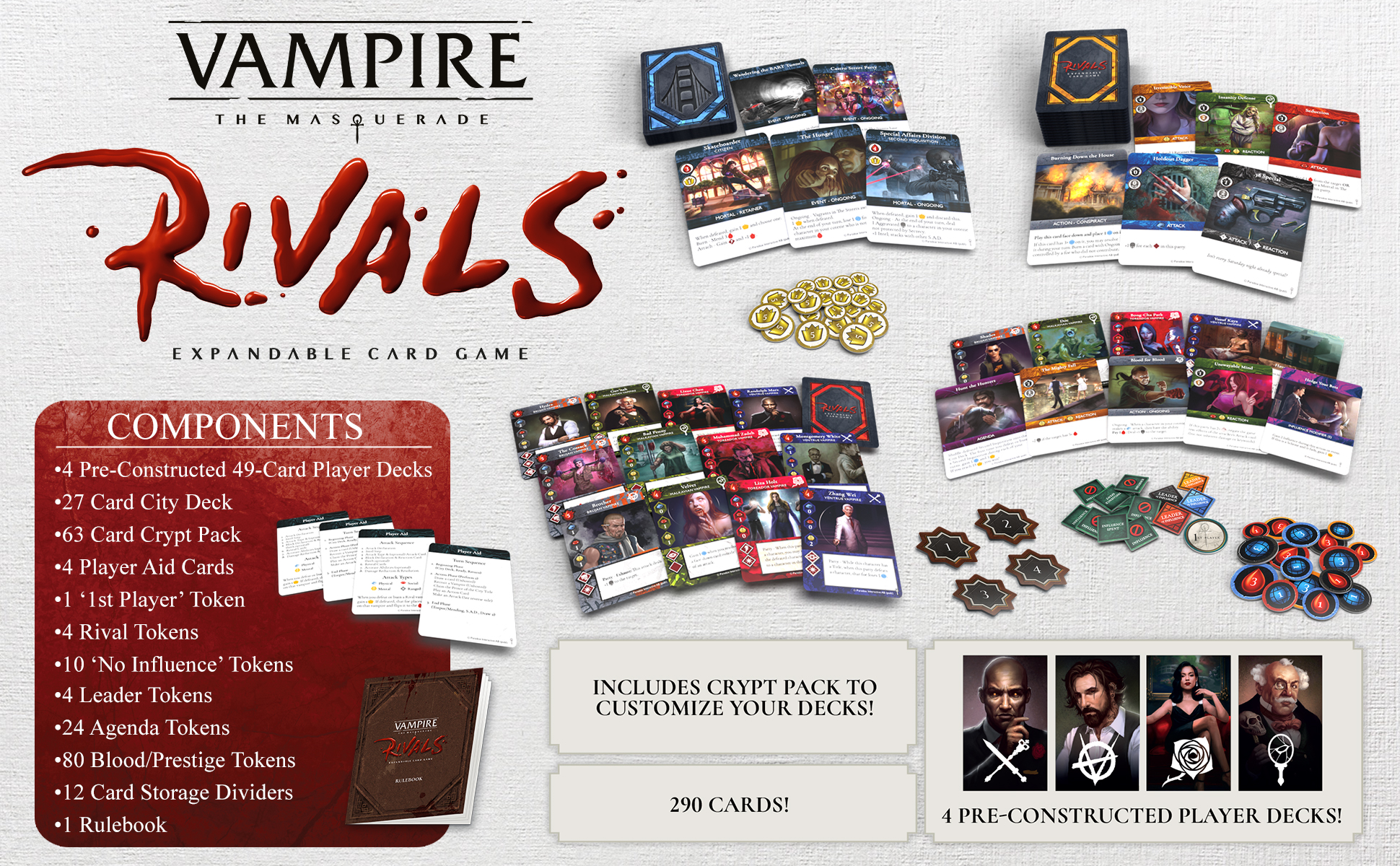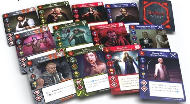 Ele também apresenta um elemento de diplomacia e traição, onde os jogadores podem fazer alianças temporárias com outros jogadores para atingir seus objetivos comuns, mas também podem trair seus aliados quando lhes convém. Como muitos jogos de cartas colecionáveis, o jogo Rivals é projetado para ter expansões adicionais que adicionam novas cartas e mecânicas ao jogo. A primeira expansão do jogo, Vampire: The Masquerade Rivals Expandable Card Game: Blood & Alchemy, foi lançada e inclui cartas para o clã Tremere e vampiros do Sangue-Ralo, além de novas cartas para o jogo base.