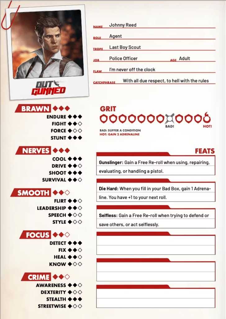 Em Outgunned, você interpreta um herói que, embora muitas vezes em desvantagem e desarmado, enfrenta inimigos poderosos e situações extremas. O jogo utiliza o sistema Director’s Cut, que se baseia em rolagens estratégicas de dados de seis lados para resolver ações arriscadas. O objetivo ao rolar os dados não é obter o valor mais alto, mas sim combinar o maior número de símbolos iguais. Isso torna o jogo menos dependente da sorte e mais focado em estratégia e decisões rápidas, especialmente em momentos de alto risco, proporcionando uma experiência intensa e empolgante.