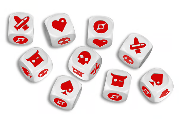 Outro item que faz parte da produção é o conjunto de Dados de Ação, que contém nove dados de seis faces, vermelho sobre branco. Cada face do dado tem um símbolo personalizado para facilitar o reconhecimento quando você rola dois, três e quatro do mesmo tipo.