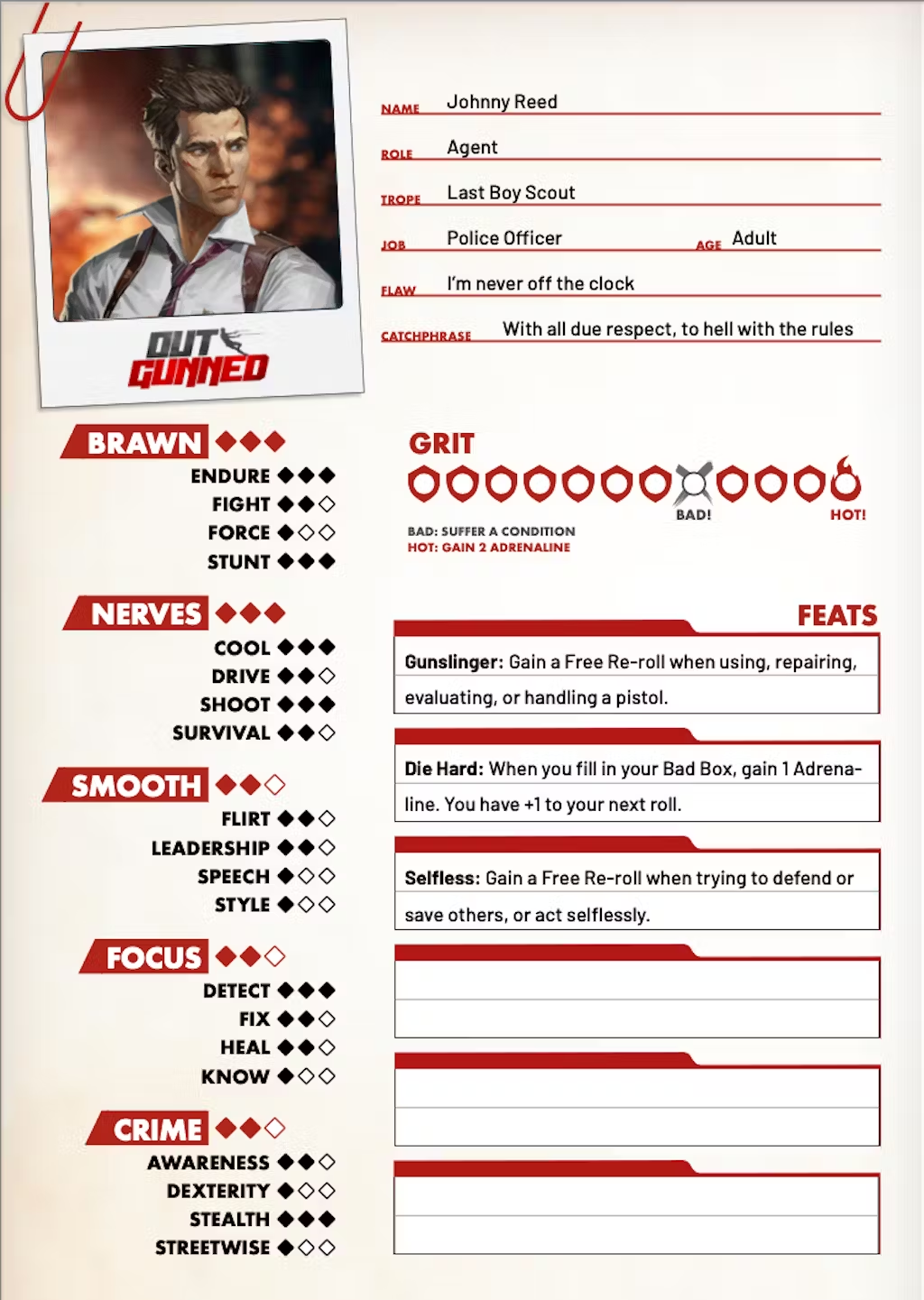 Em Outgunned, você interpreta um herói que, embora muitas vezes em desvantagem e desarmado, enfrenta inimigos poderosos e situações extremas. O jogo utiliza o sistema Director’s Cut, que se baseia em rolagens estratégicas de dados de seis lados para resolver ações arriscadas. O objetivo ao rolar os dados não é obter o valor mais alto, mas sim combinar o maior número de símbolos iguais. Isso torna o jogo menos dependente da sorte e mais focado em estratégia e decisões rápidas, especialmente em momentos de alto risco, proporcionando uma experiência intensa e empolgante.