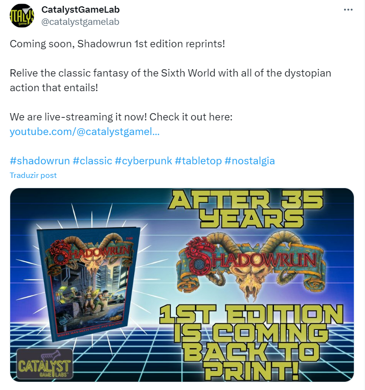 Os fãs do clássico RPG Shadowrun têm um motivo para comemorar: a Catalyst Game Lab anunciou neste fim de semana em uma postagem no X (antigo Twitter) que a primeira edição do jogo está sendo reimpressa! Essa notícia emocionante ressuscita as origens do Sexto Mundo, trazendo consigo toda a nostalgia e ação distópica que conquistaram os jogadores desde o seu lançamento.