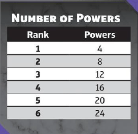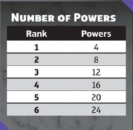 Cada Origem proporciona ao personagem acesso a poderes específicos de sua origem, além de poderes genéricos. Essa abordagem evita que a escolha de poderes para a criação da ficha do personagem pareça desconexa ou repleta de opções sem sentido. É importante também explicar que os poderes não possuem pontos. Ou seja, um personagen de Rank 1 compra 4 poderes, enquanto o de Rank 2 compra 8, conforme tabela ao lado.