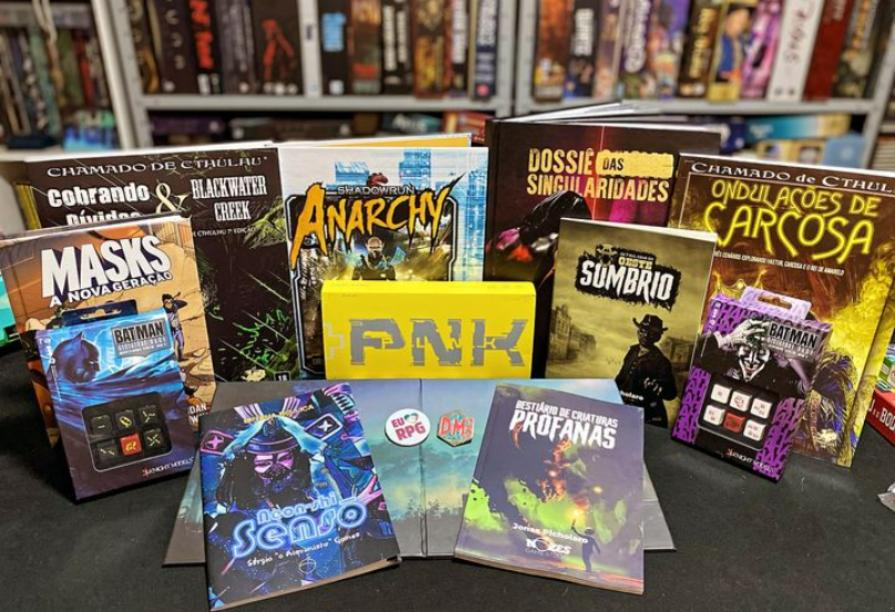 Em termos de RPG, tivemos o lançamento nacional de “Masks” pela editora Circuito Camaleão, que explora o cenário de super-heróis adolescentes ocupando o lugar da antiga geração de heróis. Utilizando o sistema PbTA, é uma excelente opção para quem gosta do tema. Também tivemos a Secular Games com o inovador “CBR PNK”, que explora o cenário cyberpunk em uma embalagem compacta com tudo que narradores e jogadores precisam para jogar, usando fichas que podem ser riscadas e depois apagadas, ideais para um início rápido de jogo. A New Order apresentou o “monstro” “Máscaras de Nyarlathotep”, enquanto a Galápagos trouxe “Caçador: A Revanche”, do Mundo das Trevas. A Nozes Game Studio exibiu sua linha de jogos baseada no sistema Nefastus, e eu aproveitei para adquirir alguns livros que ainda não tinha da editora, como “As 7 Baladas do Oeste Sombrio”, “Neon-Shi Sensö” para “Urbana Bellica” e “Bestiário de Criaturas Profanas”, que traz uma extensa lista de criaturas, desde o folclore nacional até extraterrestres. Maravilhoso.