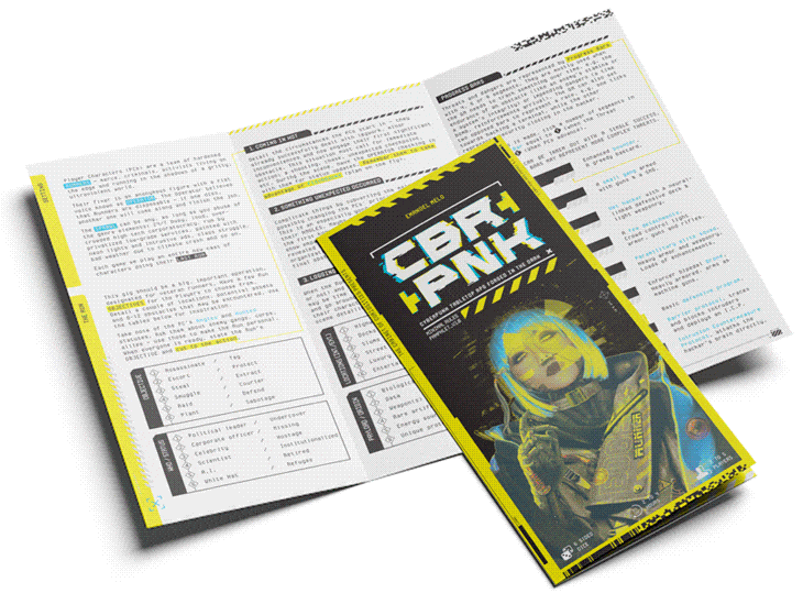O CBR+PNK é um RPG de mesa projetado para sessões rápidas no gênero cyberpunk. Nele, você assume o papel de uma equipe de RUNNERS — mercenários, criminosos e ativistas que vivem à margem da sociedade, correndo nas sombras de um mundo ultraviolento e sombrio. A aventura se desenrola em seu ÚLTIMO TRABALHO.