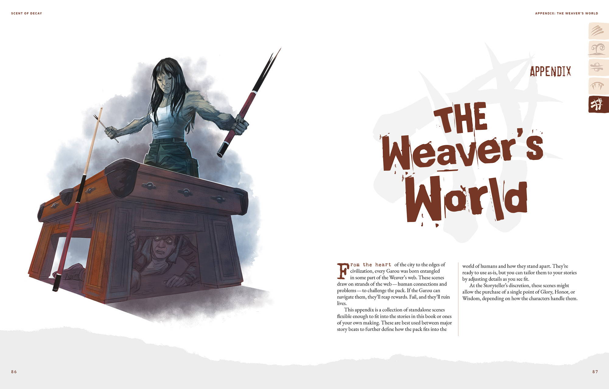 Lugares Corrompidos: Um ponto forte de Scent of Decay é a descrição de locais onde a influência da Wyrm é palpável. Áreas corrompidas, sejam elas no mundo físico ou na Umbra, são detalhadas com mecânicas específicas que refletem os desafios de lidar com esses ambientes. Os narradores encontram aqui ferramentas para criar atmosferas opressivas, onde a presença da Wyrm é sentida em cada canto, e os Garou precisam lidar com a degradação tanto física quanto espiritual desses lugares.