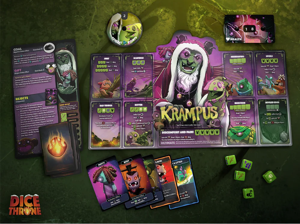 Dice Throne: Santa x Krampus é um spin-off temático da série Dice Throne, que transforma a noite de Natal em uma batalha épica entre o bom velhinho, Santa Claus, e o aterrorizante Krampus. Publicado pela Roxley Games, o jogo traz mecânicas de combate estratégicas combinadas com uma ambientação única que captura tanto a magia quanto o caos do Natal. Este jogo foi financiado através de uma campanha bem-sucedida no Kickstarter, onde 11.628 apoiadores contribuíram com $831.397 para tornar o projeto realidade.