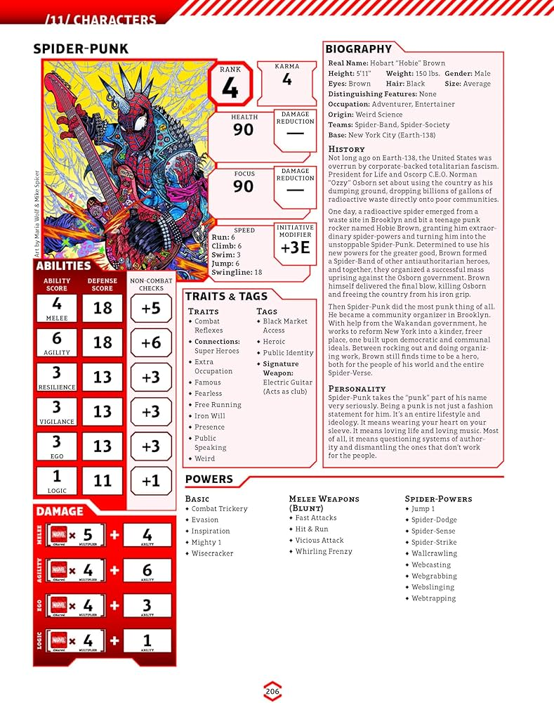 Para encerrar o suplemento, o Capítulo 11 traz uma seleção de fichas prontas com nada menos que 96 personagens, incluindo heróis, vilões e, ainda, duas páginas extras dedicadas aos ajudantes dos vilões. Além disso o livro contém vários mapas para serem usados nas aventuras e dicas de como iniciar uma campanha ou aventura one-shot — facilitando a vida de narradores e oferecendo inspiração imediata para aventuras ambientadas no Aranhaverso.
