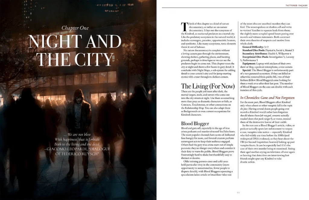 1. Ecologia da Noite: O primeiro capítulo de Tattered Façade detalha a “ecologia da noite”, explorando quem vaga pelas ruas após o anoitecer: vítimas, rivais, inocentes e monstros. Ele expande o sistema de Caça do livro básico de V5, trazendo profundidade para evitar que as caçadas se tornem repetitivas. O capítulo apresenta 14 fichas de NPCs que os vampiros podem encontrar na noite, como um médico legista, um repórter/cinegrafista ou até um serial killer. Esses NPCs podem servir como contatos, Pilares ou inimigos, enriquecendo as interações na crônica. Já pensou se na aventura um vampiro mata uma vitíma que estava na lista de um serial killer que vê tudo e agora que sabe que essas criaturas existem deseja também ser trasnformado ou então irá expor a Máscara?