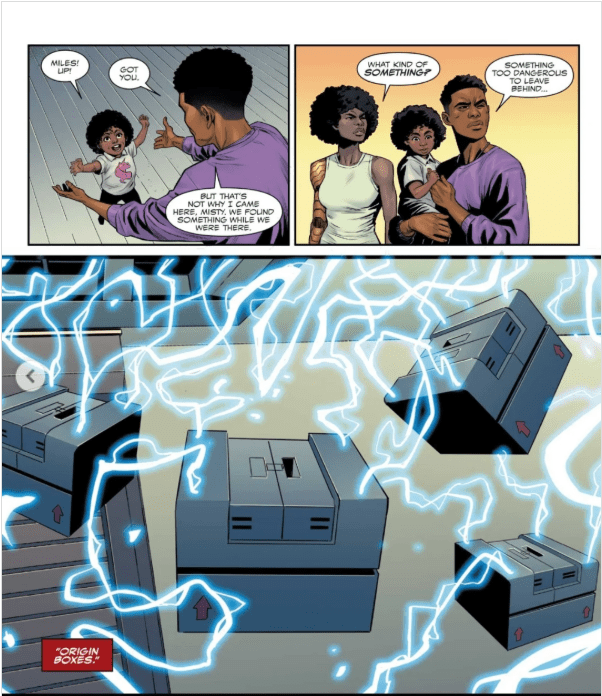 Tudo começa no Universo Ultimate (Terra-1610), que foi destruído durante o evento Guerras Secretas por uma Incursão – basicamente, um choque fatal entre realidades. Sobreviventes? Miles Morales, o nosso Homem-Aranha Ultimate, e um Reed Richards maligno apelidado de “O Criador”. Esse Reed recriou o Universo Ultimate, mas sem super-heróis ou vilões: um mundo “normal” onde ele manipulou o passado para impedir a emergência de poderes. Para equilibrar as coisas, um jovem Tony Stark (durante um exílio de dois anos imposto por Howard Stark) inventou as Caixas de Origem.