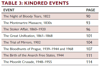 O capítulo aborda eventos significativos da história vampírica dos últimos duzentos anos — o período em que um ancilla mais velho pode ter vivido. Seu personagem pode ter memórias de eventos mortais importantes e, da mesma forma, pode ter sido impactado ou participado diretamente de algo que mudou o mundo dos vampiros. Muitos desses eventos são locais, mas têm significado simbólico muito além daqueles que afetaram diretamente. A Segunda Revolta Anarquista começou com o nascimento dos Estados Livres Anarquistas, mas certamente não terminou aí. Mesmo nas noites modernas, os Membros às vezes usam esses eventos como pontos de referência ao falar do presente. Alguém pode dizer sobre um próximo casamento de sangue: “Isso vai ser outra Noite de Lágrimas Sangrentas, não é?”
