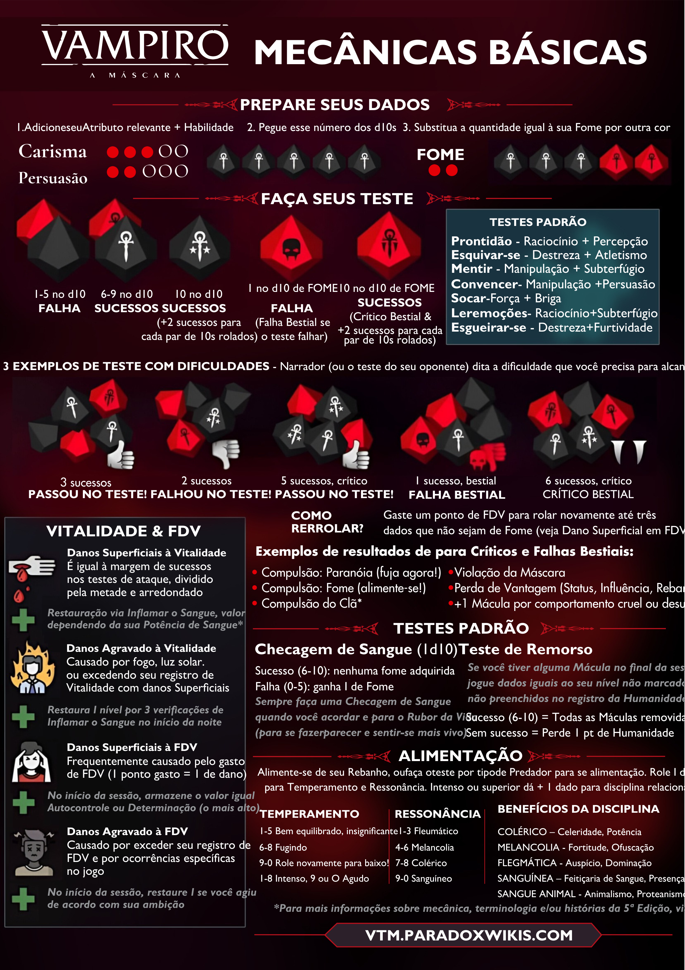 Neste Mês das Trevas quero também deixar minha contribuição para os jogadores e narradores dos jogos do Mundo das Trevas. Deixo abaixo um esquema com as mecânicas básicas de Vampiro: A Máscara 5ªed. e Lobisomem: O Apocalipse 5ªed. feito pela galera do Paradox Wikis para facilitar a compreensão dos testes. Acredito que será util tanto para novos jogadores quanto os mais experientes.